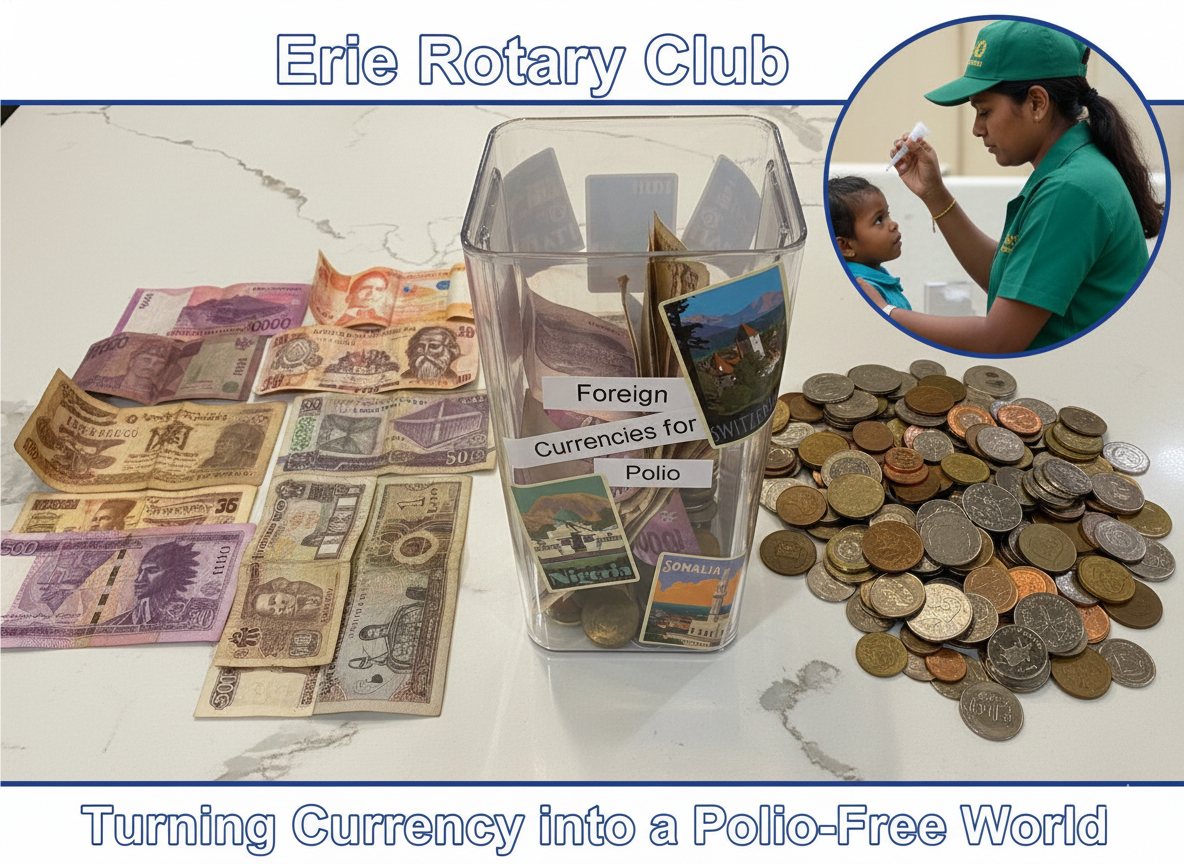 Did you know that the Erie Rotary Club is collecting leftover foreign currency to help end Polio forever? Whether it’s a few Euros from a summer vacation, Yen from a business trip, or Pesos from a getaway years ago—those coins sitting in your junk drawer have the power to save lives.